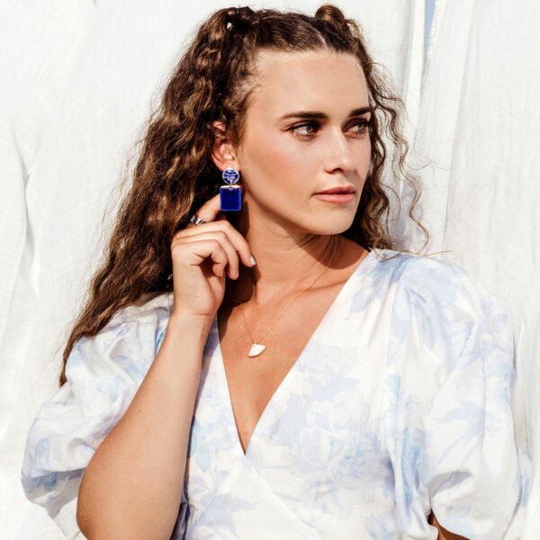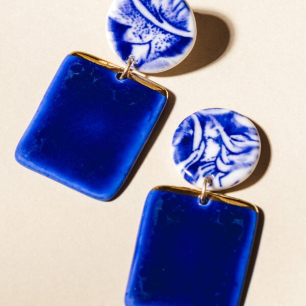 Indulge your love for handcrafted jewelry with the stunning Flourish Midi Earrings from Sojourn Studio. who specializes in handmade clay jewelry. These captivating earrings are hand painted with a vibrant blue and feature a unique two-piece design. The delicate porcelain is elegant with an artistic flair. while the midi length adds a touch of sophistication to any outfit. making them ideal for both everyday wear and special occasions. These earrings are sure to become a conversation starter!