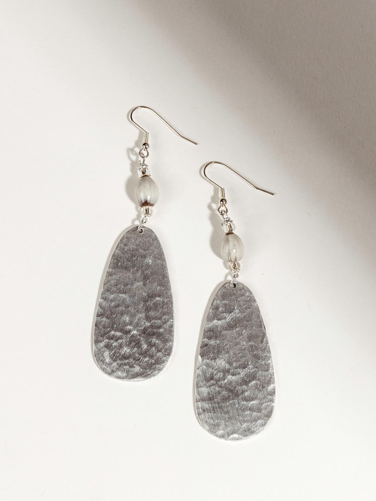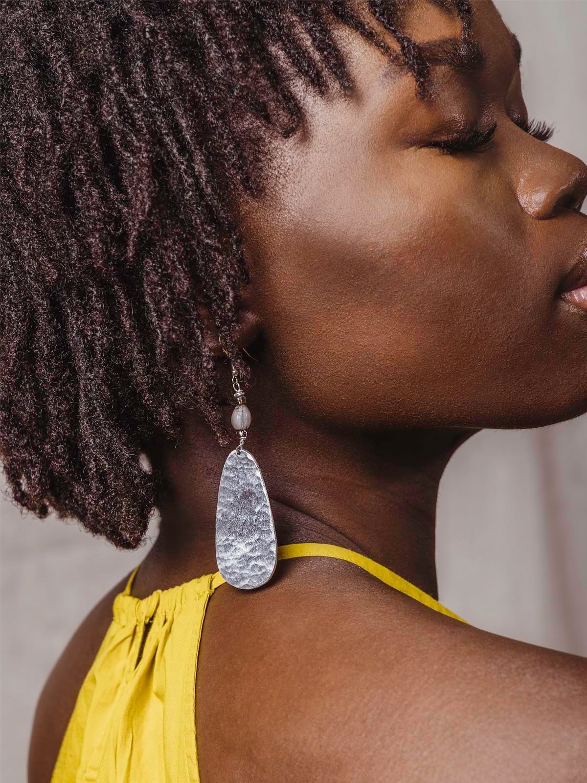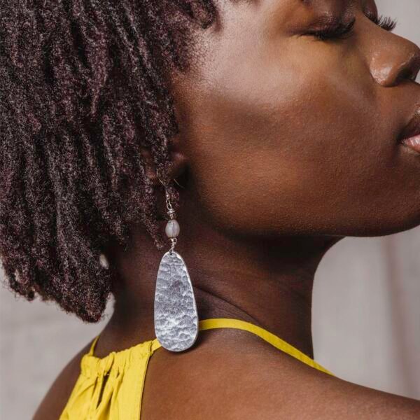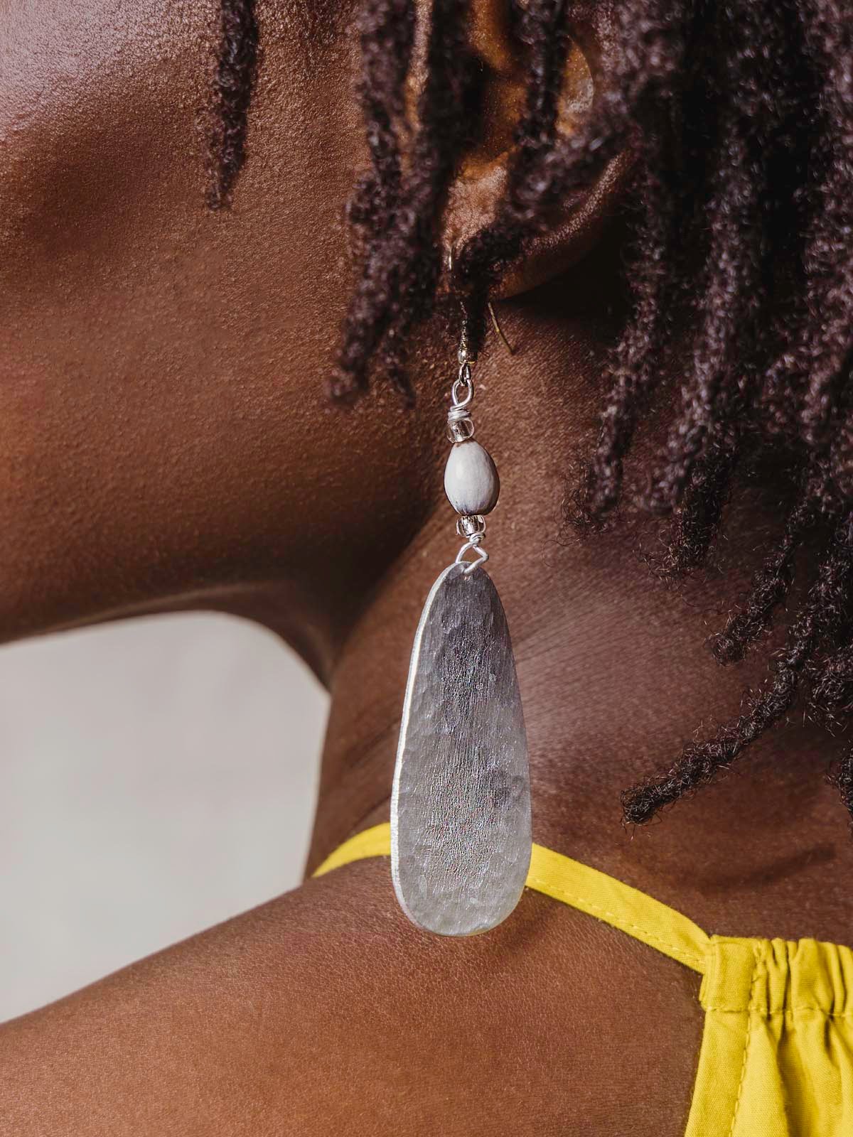 Lightweight hammered aluminum pendants in a classic teardrop shape combine with hand-dyed beads to create an eye-catching and refined pair of earrings. Crafted from locally sourced upcycled aluminum and natural Haitian majok beads ?C these lightweight dangles will be your new go-to accessory!