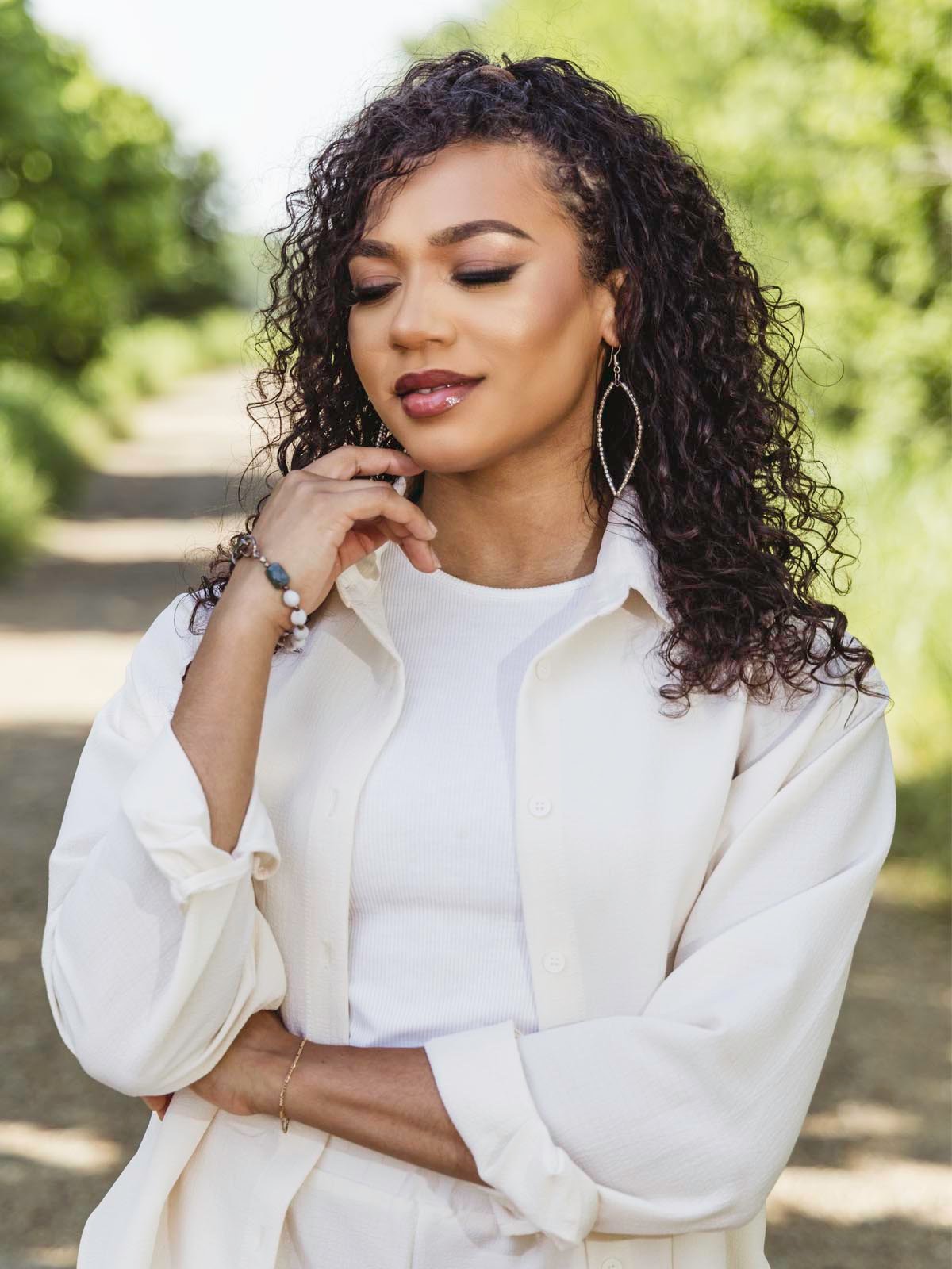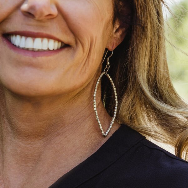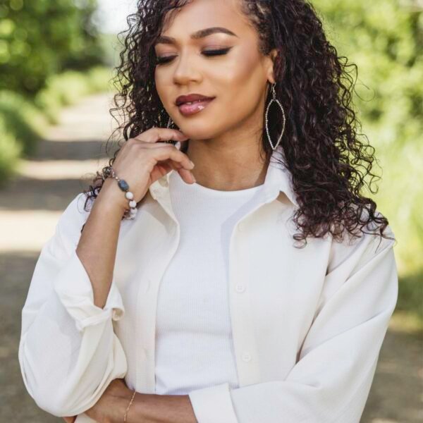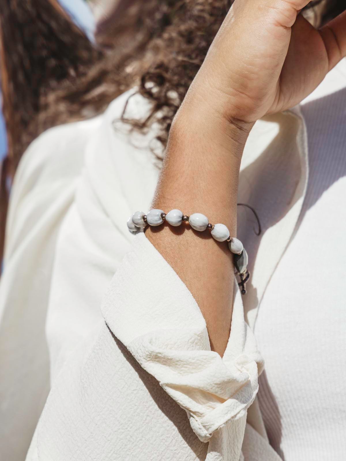 This cutie is the perfect complement to any casual outfit. Stack it with other bracelets or wear it on its own. Handcrafted with a mix of cream and grey-toned Haitian Majok beads. silver accent beads. and two faceted green jasper gemstones.